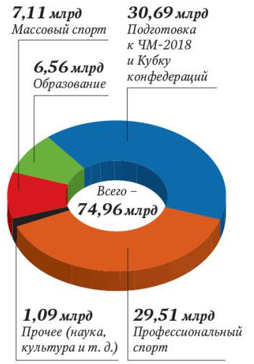 Вишенка на торт: половина этой суммы, 30,69 млрд, ушли на спортивные шоу: Кубок конфедераций – 2017 и чемпионат мира по футболу – 2018… Всё равно как если бы государство начало помогать деньгами Филиппу Киркорову и Стасу Михайлову. Неудивительно, что при таком государственном финансировании спорт-бизнес потерял форму, просто заплыл жиром.