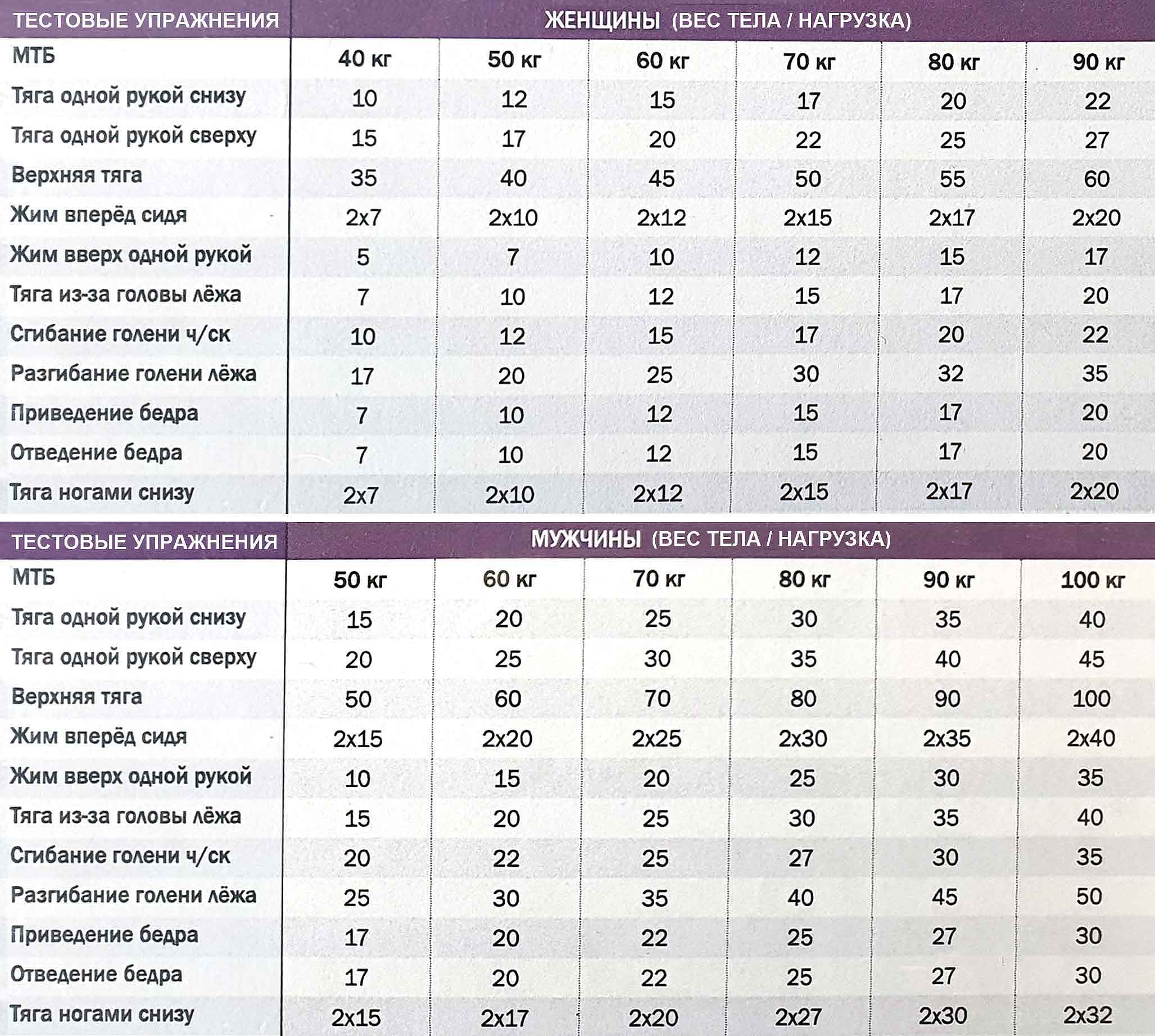 В таблице перечислены виды упражнений на МТБ (многофункциональном тренажёре Бубновского), и для каждого нормы рабочих весов на 20-25 повторов. Всего нормативов 11, они составлены для трёх «этажей» человеческого тела. Первый «этаж» − ноги и низ корпуса, второй − средняя часть тела, третий − верхняя часть, включая плечевой пояс и шею.