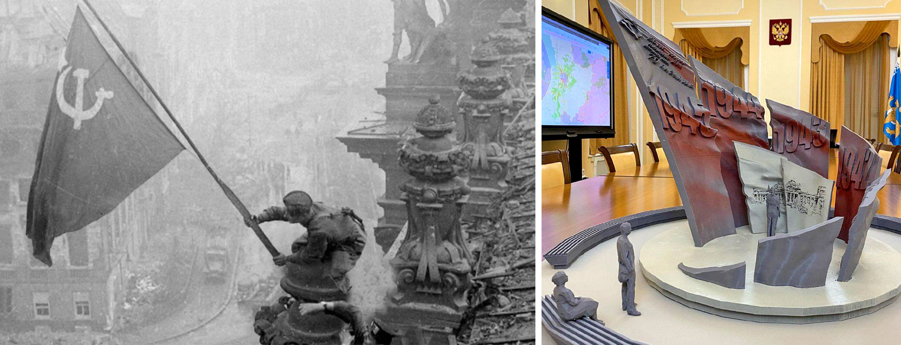 Напомним, какого огромного труда стоило в 2007 году сломить сопротивление партии Мединского − «Единой России» тому, чтобы Знамя Победы стало официальным государственным символом. Тогда у них не вышло, и Знамя Победы сейчас государственное один день в году, 9 Мая. Однако побеждённые исподтишка пытаются взять хотя какой-то реванш, выбирая решения, фальсифицирующие изображаемое содержание.